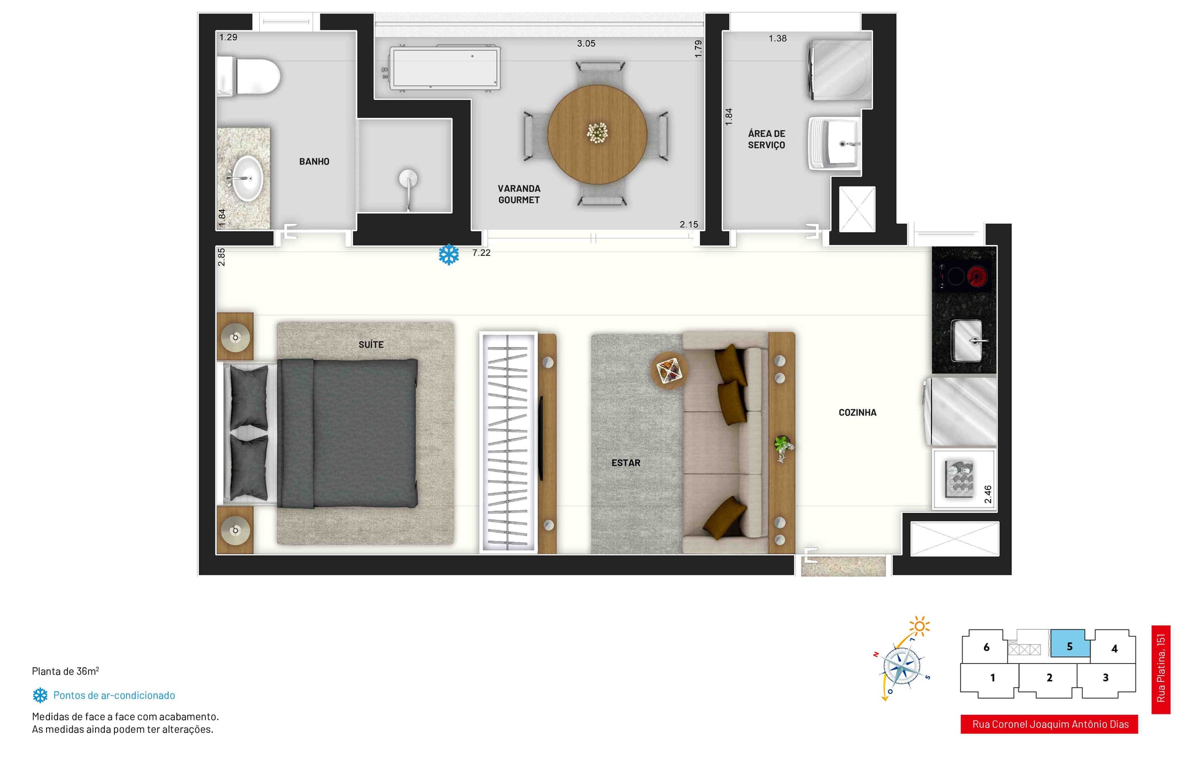 O prédio tem 124 apartamento, com 3 tipos de plantas espetaculares: studio com 36 m² que tem até varanda, apartamentos de 1 dormitório com 52 m² e apartamentos de 2 dormitórios com 66 m².