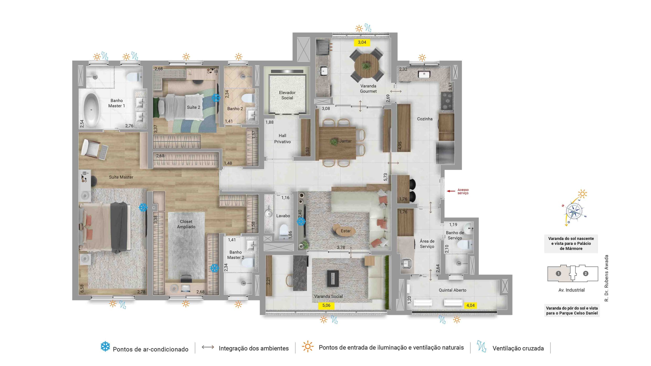 Serão 162 apartamentos de 165m², com depósito privativo na garagem, 3 suítes, lavabo e um diferencial exclusivo: sala com duas varandas, o que possibilitará a ventilação cruzada, sendo uma social e outra gourmet com churrasqueira carvão. Ideal para receber amigos e familiares.